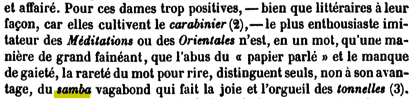 "Pour ces dames trop positives,—bien que littéraires à leur façon, car elles cultivent le carabinier,—le plus enthousiaste imitateur des Méditations ou des Orientales n'est, en un mot, qu'une manière de grand fainéant, que l'abus du «papier parlé» et le manque de gaieté, la rareté du mot pour rire, distinguent seuls, non à son avantage, du samba vagabond qui fait la joie et l'orgueil des tonnelles.